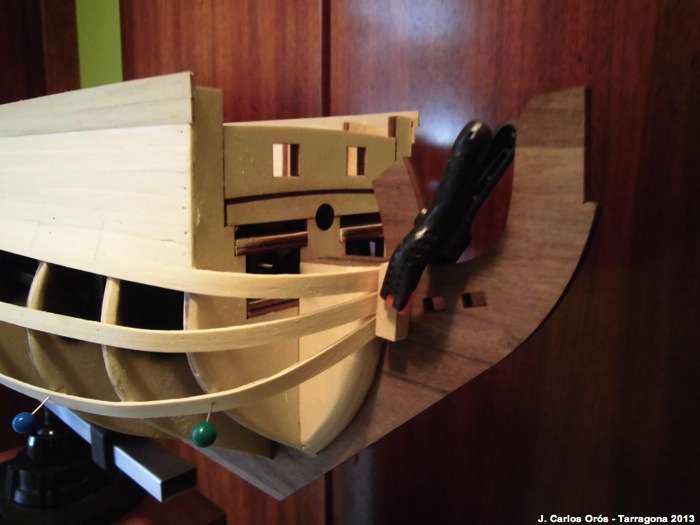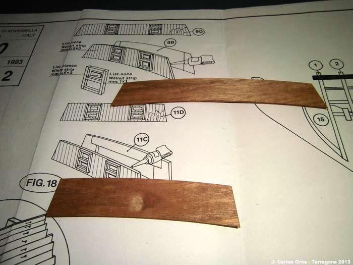 Seguimos con las troneras. El tema de la plantilla es más una necesidad que un invento. El gran problema es que las espigas de madera donde irán los falsos cañones quedan ocultas y la plantilla que trae el kit es…