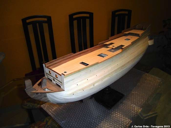 Hola amigos. Aquí estamos con la segunda entrega de las “cientos” que preveo del montaje del San Felipe. Antes de empezar con el forrado de la cubierta, he preferido pintar de negro las mechas de madera que llevarán los falsos…