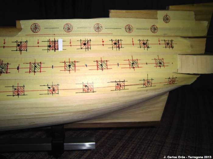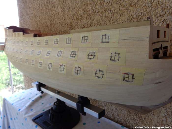 Hola Compis Voy a empezar con las troneras del lado de babor. Para ello he colocado cinta de carrocero sobre la zona donde irán las troneras para poder marcar sin miedo. Revisando las marcas de la plantilla realizadas hace unos…