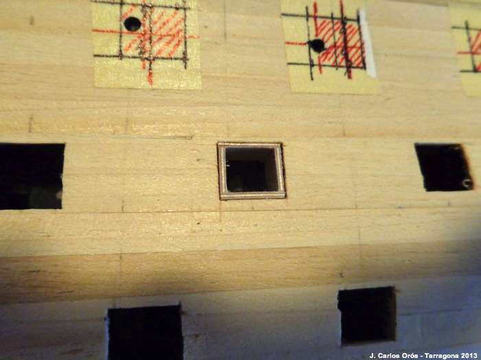 Ya por fin, terminé las troneras del lado de babor. Al final he tenido que hacer dos tipos de marcos, para las cubiertas 3 y 2 del mismo tamaño y para la cubierta principal un pelín más grande. Ahí van…