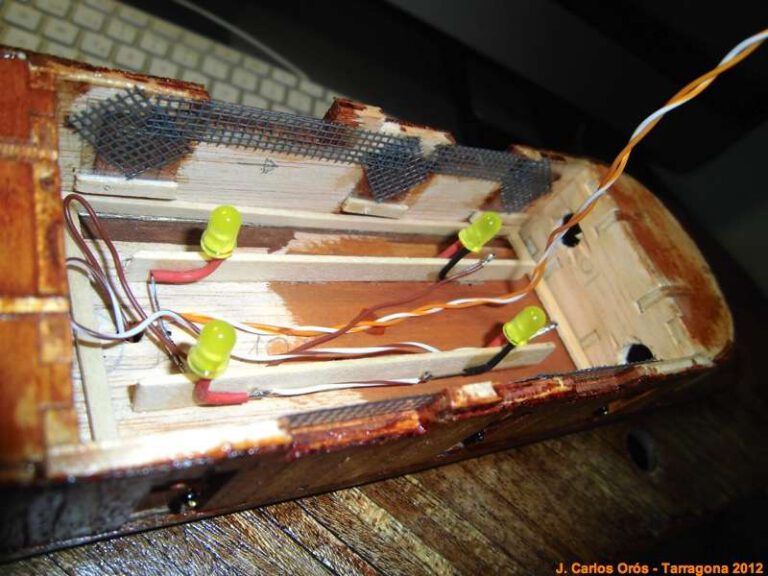 Ya estamos en la segunda cubierta….. Aquí el proceso es idéntico a la primera, forrar las paredes y tintar. Como novedad, dado que el modelo va iluminado, se sustituyen las ventanas de metal por unas caseras realizadas con alambre y…