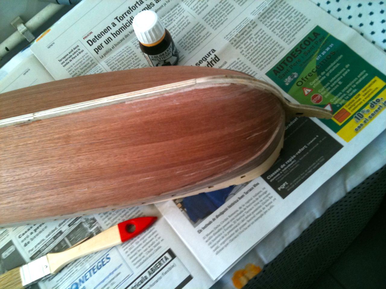 Colocación de la roda y los trozos de quilla y preparación para el tinte del casco.