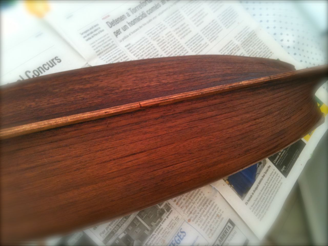 Terminado el segundo forro del casco, procedemos a forrar con tiras de ramín de la pared exterior de las amuradas, colocación de cintones y colocación de la roda y elementos de la quilla. Queda pendiente el codaste que se colocará más adelante.
