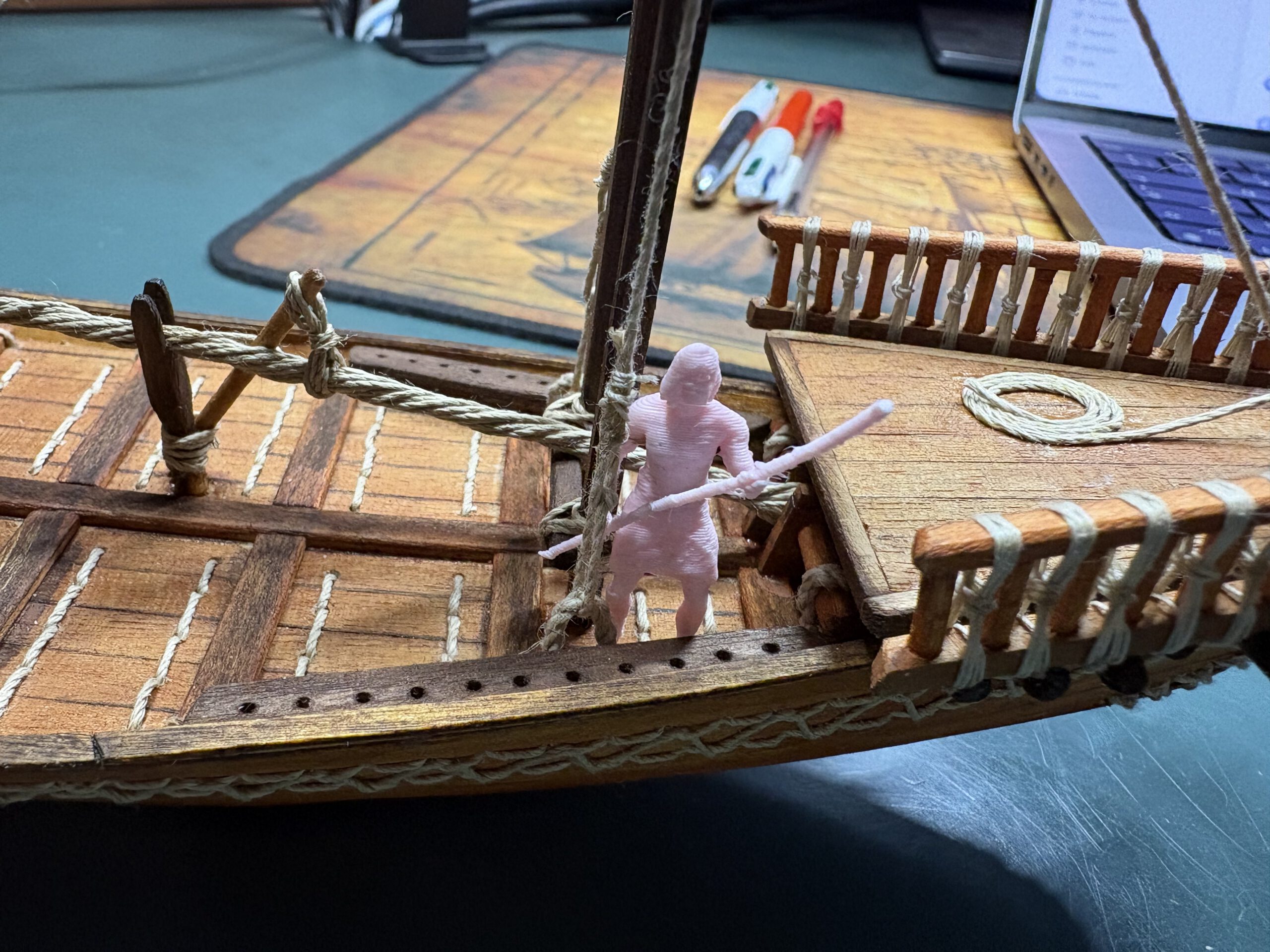 Réplica de una fragata del siglo XVIII, personalizada con detalles propios y figuras a escala que aportan vida al conjunto.